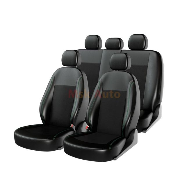 Чехлы на сиденья экокожа «ATOM LEATHER», чёрный/чёрный/зелёный, универсальные, 10955